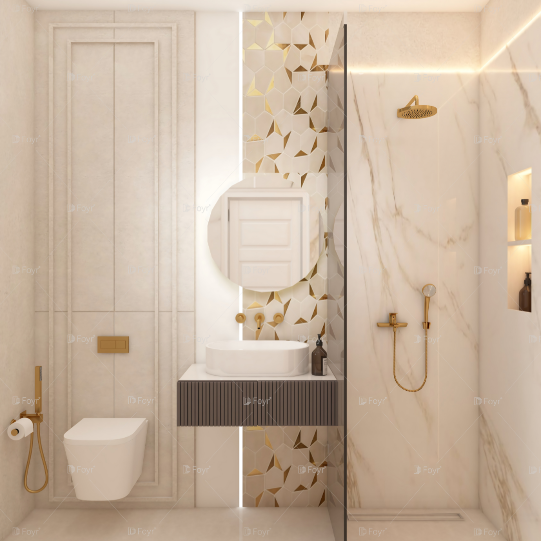 A soft color palette paired with gold fittings brings sophistication to this marble-clad bathroom. The textured wall tiles and sleek round mirror add subtle visual interest to the minimalist layout.