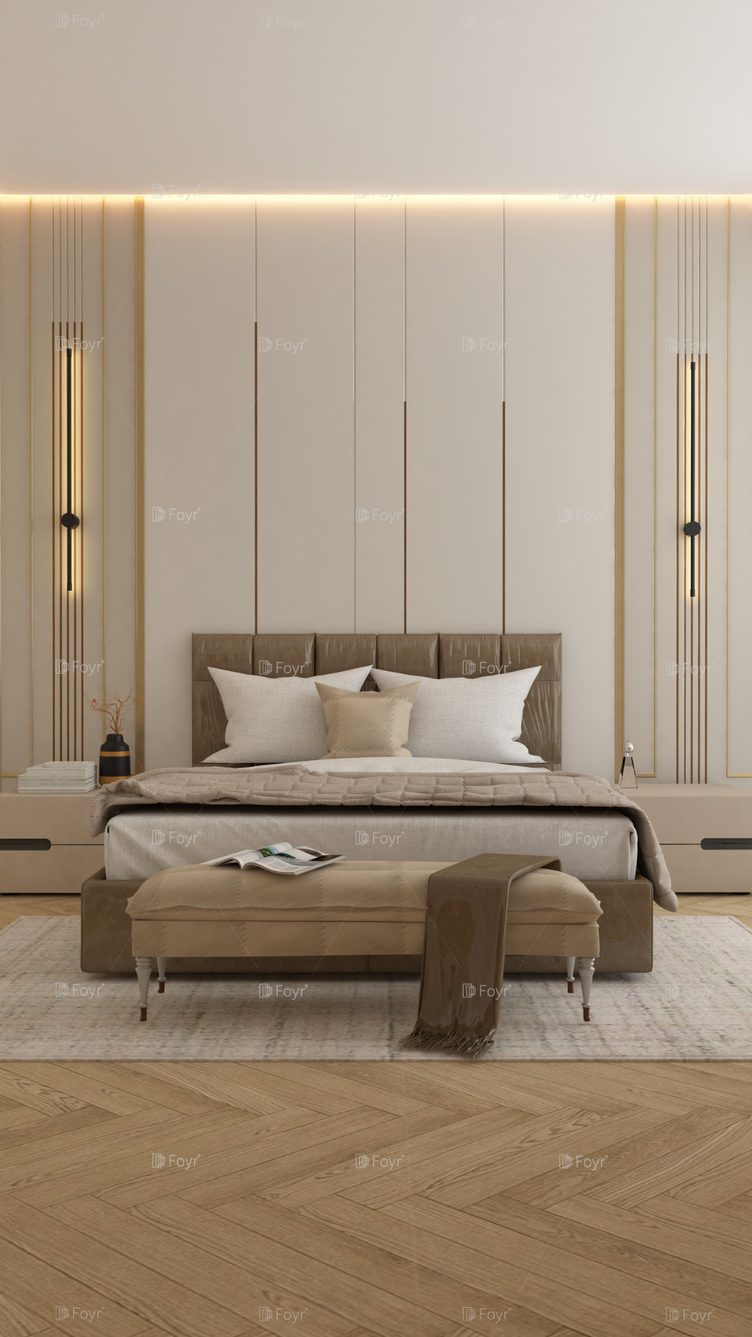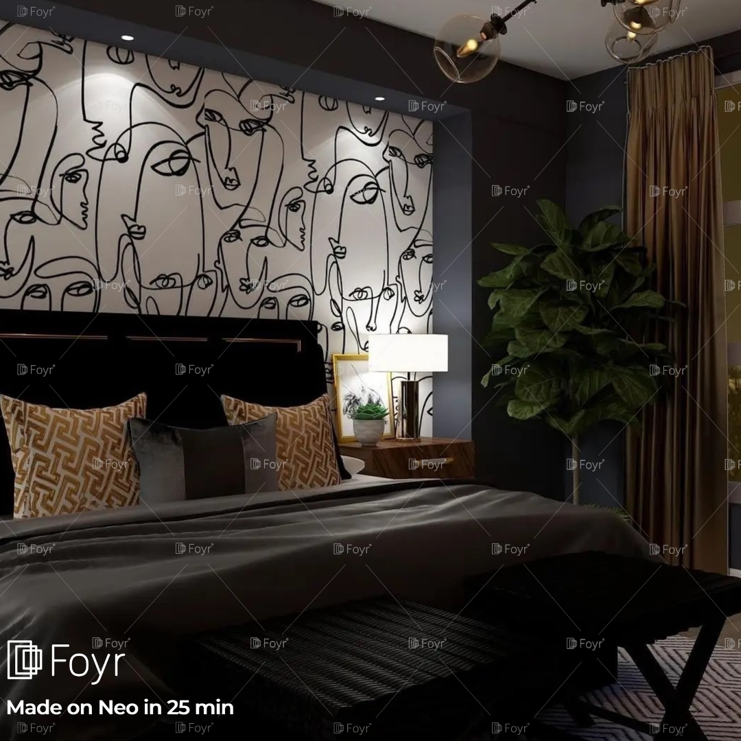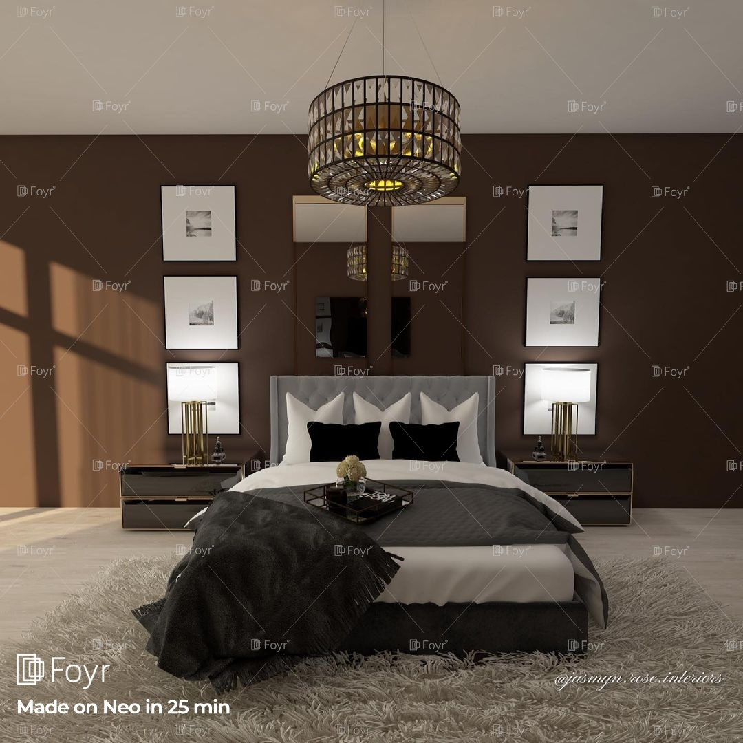 This bedroom radiates bold sophistication with its rich chocolate brown walls and plush gray accents. The tufted gray headboard paired with monochrome bedding and black velvet throw pillows exudes modern luxury. Gold elements shine through in the bedside lamps and hardware, subtly elevating the dark palette. A woven statement chandelier adds texture and warmth overhead, while symmetrical artwork and mirrors behind the nightstands bring visual balance. Anchored by a soft, shaggy rug, this space blends moody elegance with cozy comfort—perfect for those who love a glam aesthetic with a dramatic twist.
