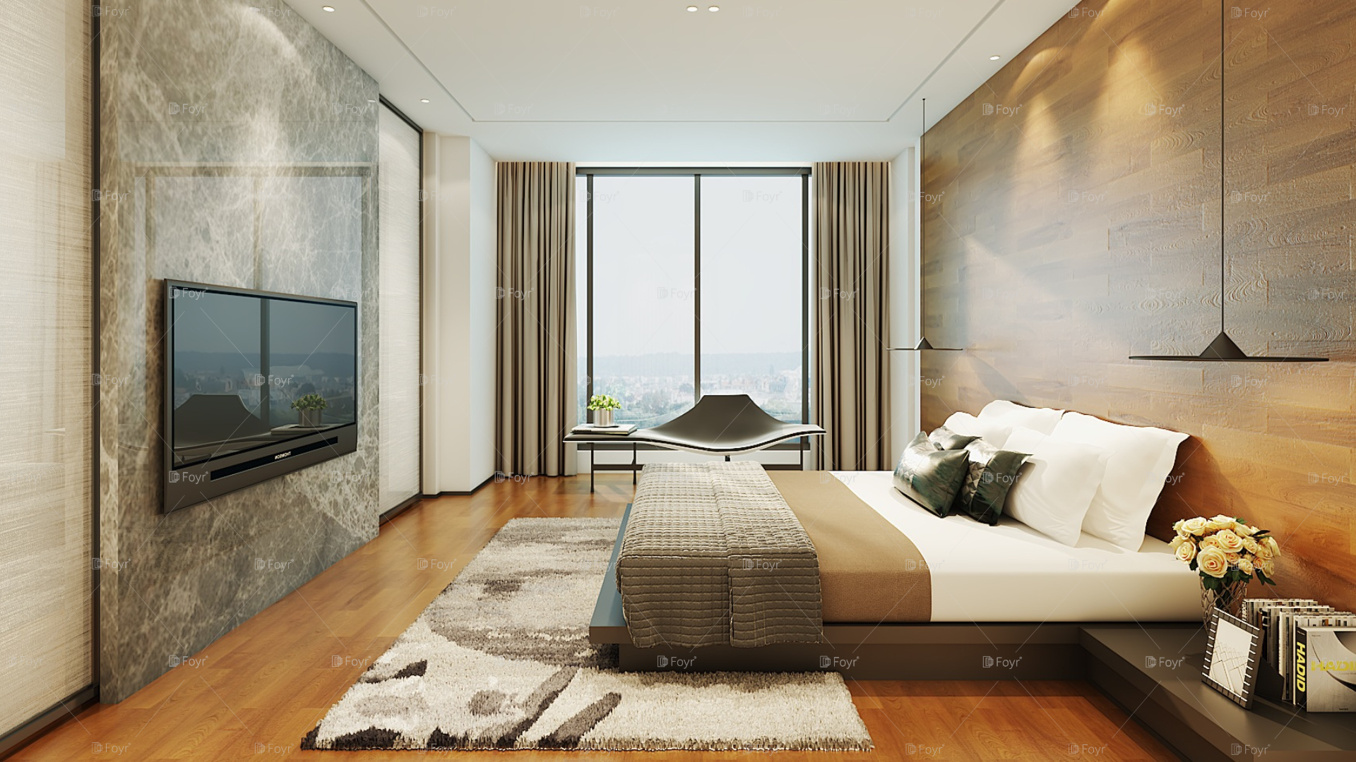 This sophisticated bedroom features a clean, minimalist layout with rich textures and earthy tones. A wood-paneled accent wall adds warmth to the otherwise sleek and neutral space, while low-hanging black pendant lights create a modern, ambient glow. The bed is grounded by a soft taupe throw and plush pillows, flanked by integrated nightstands with subtle decor touches like fresh flowers and curated books. Opposite, a large marble-clad wall holds a flush-mounted TV, contributing to the room’s polished look. Full-height windows frame a panoramic cityscape, flooding the room with natural light and offering a serene, airy escape.
