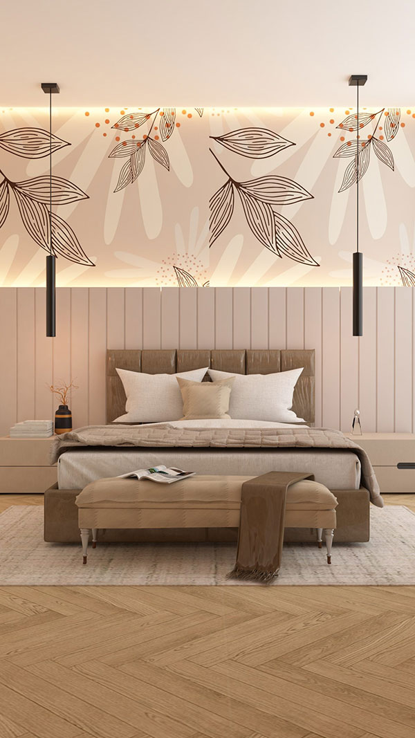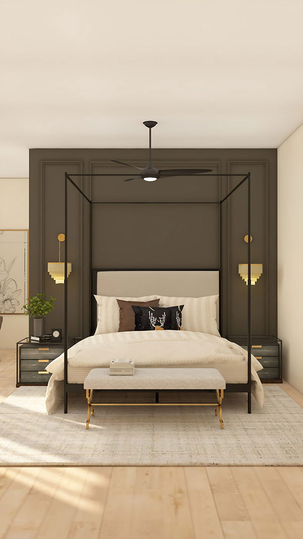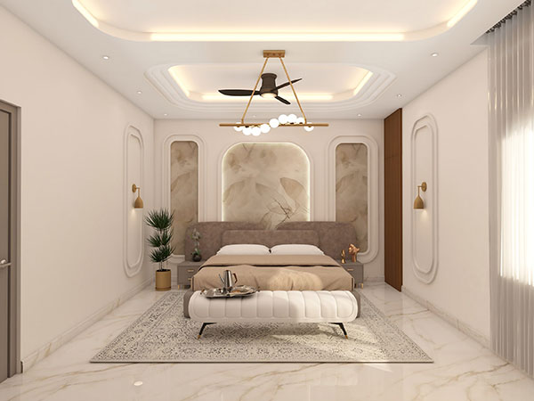 This sleek bedroom exemplifies ultra-minimalist design with its clean lines, muted color palette, and clutter-free layout. The soft gray bedding rests atop a low platform bed, while suspended linear pendant lights and a floating vanity with a glowing circular mirror add functional elegance. Subtle textures in the rug and pouf introduce quiet warmth to the refined, monochromatic space.