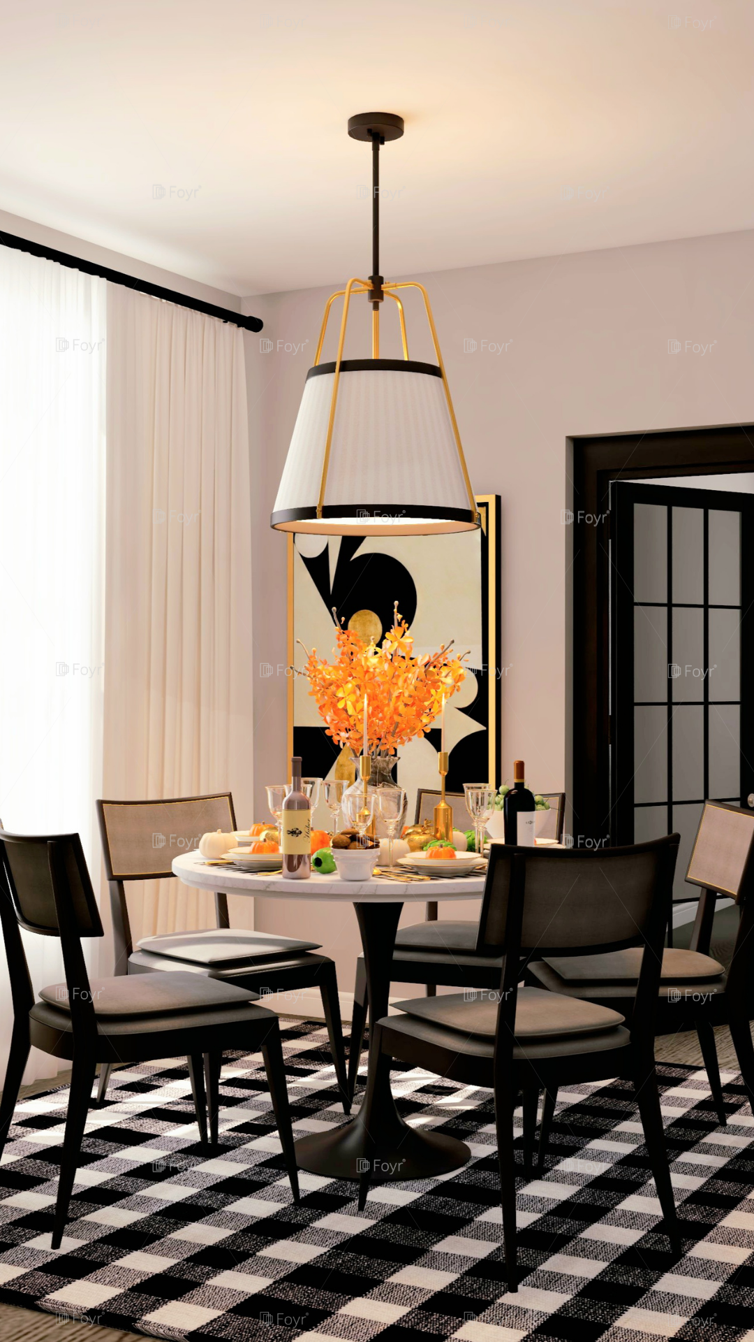 This striking dining space combines clean lines with bold visual elements. A sleek black-and-white palette is brought to life through the checkered rug, sculptural light fixture, and abstract wall art. The round marble table is set for an inviting meal, while muted upholstery and dramatic lighting add contrast and depth, creating a space that feels both energetic and refined.
