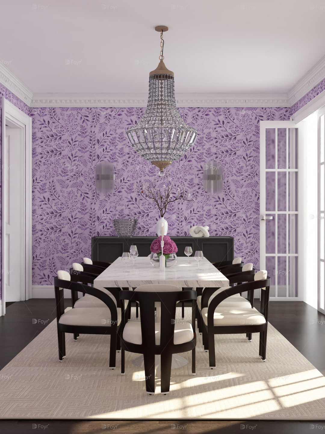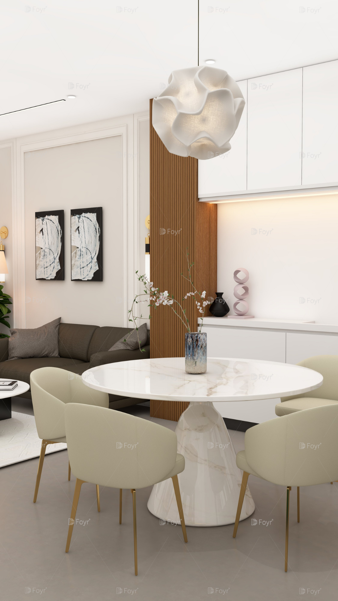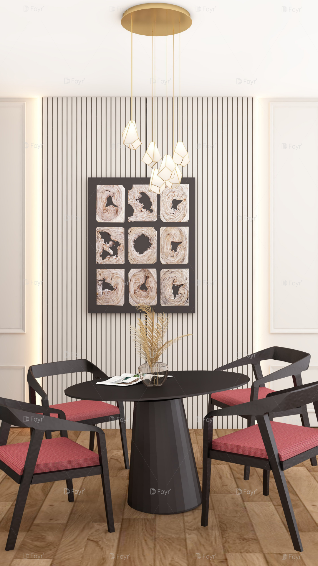 Vibrant yet composed, this corner dining space commands attention with a deep black pedestal table, rust-colored chairs, and a vertically striped wall backdrop. Abstract art and a unique chandelier inject personality, while layered neutral tones ensure a harmonious balance of color and calm.