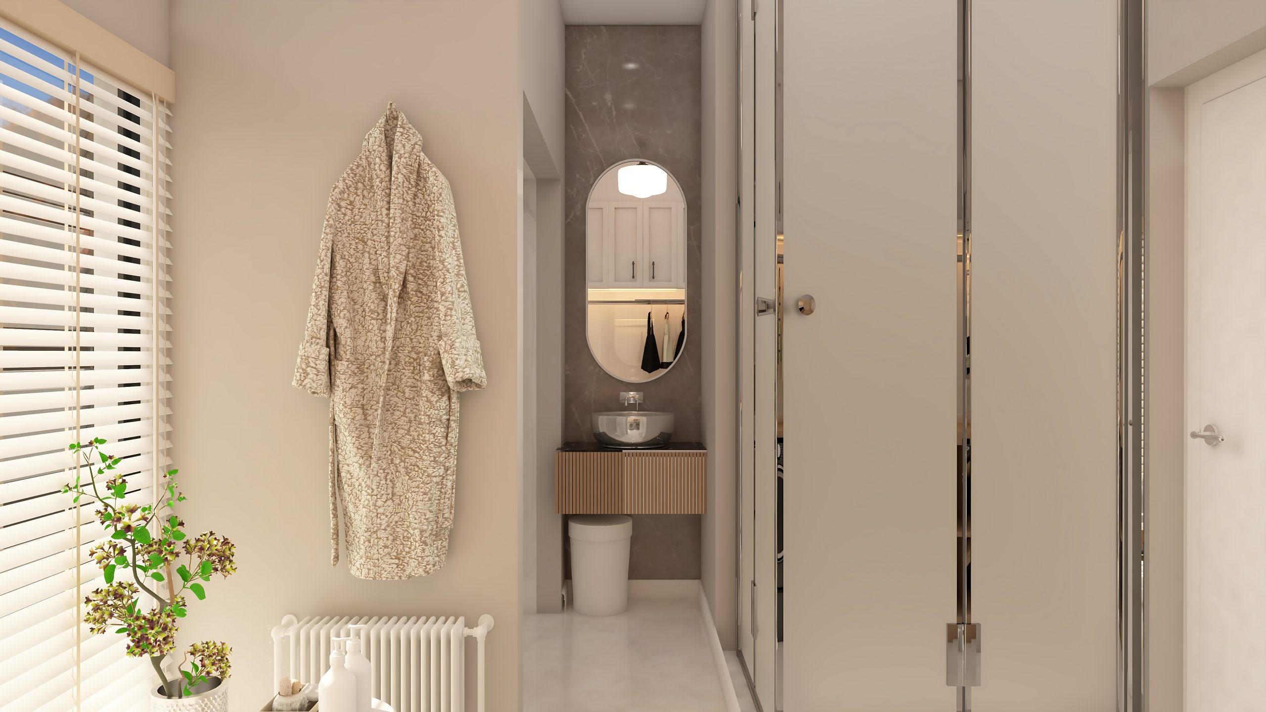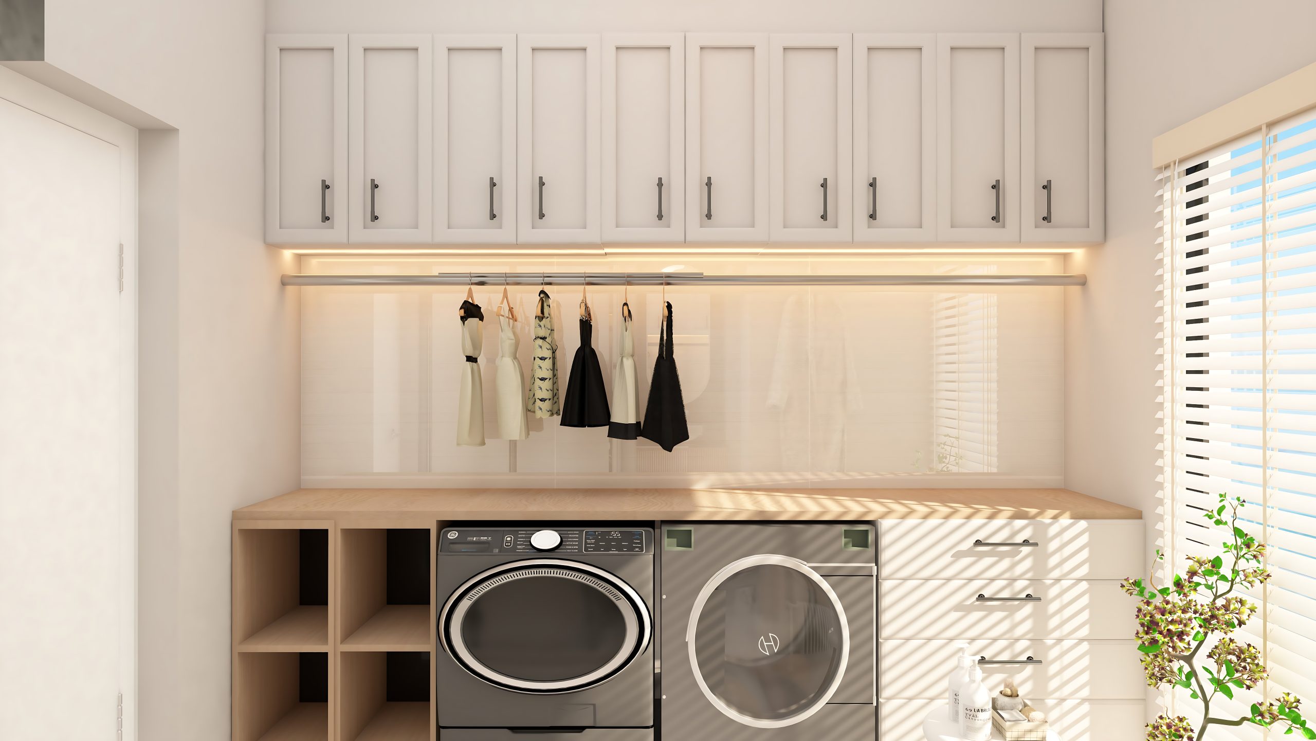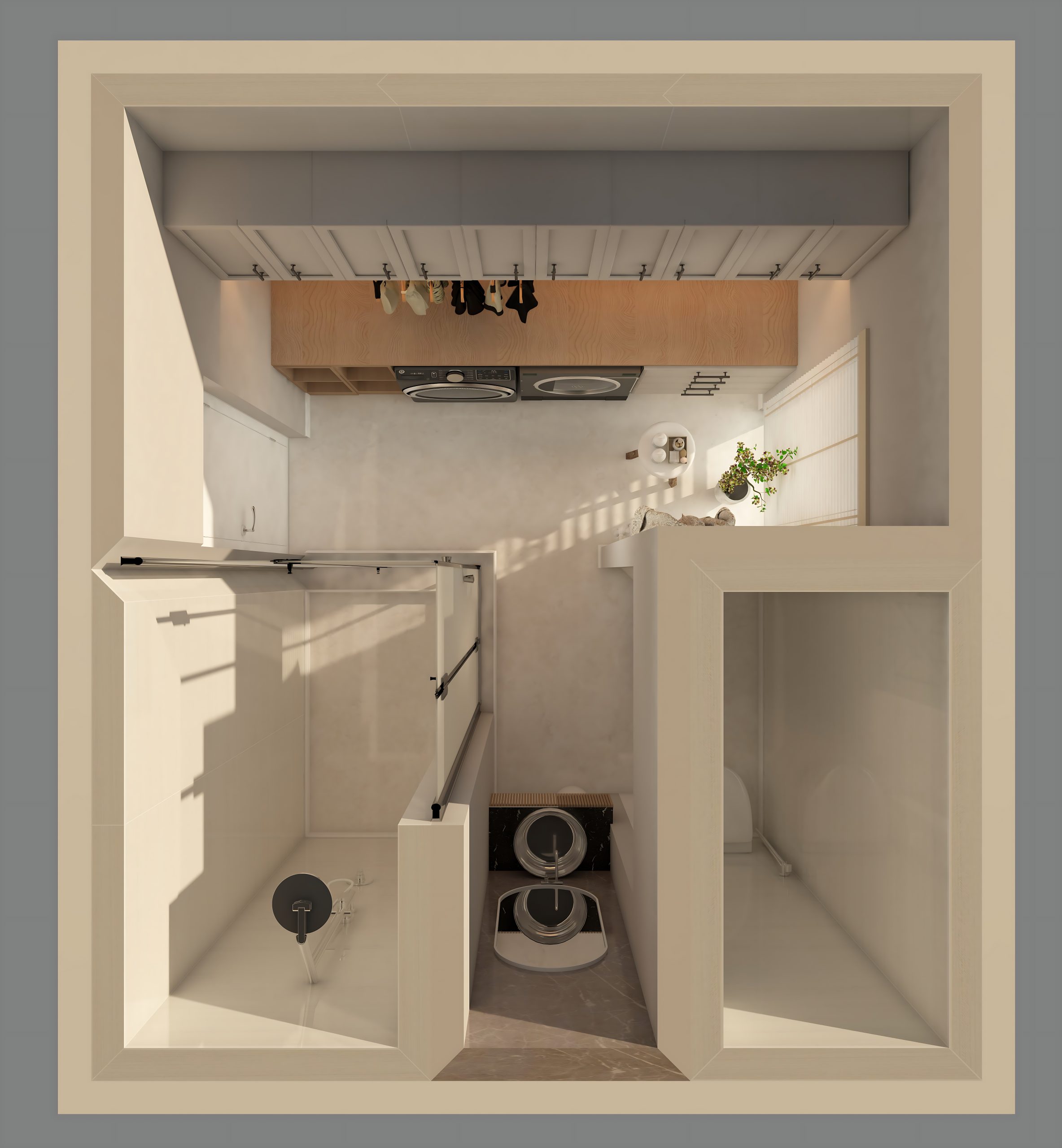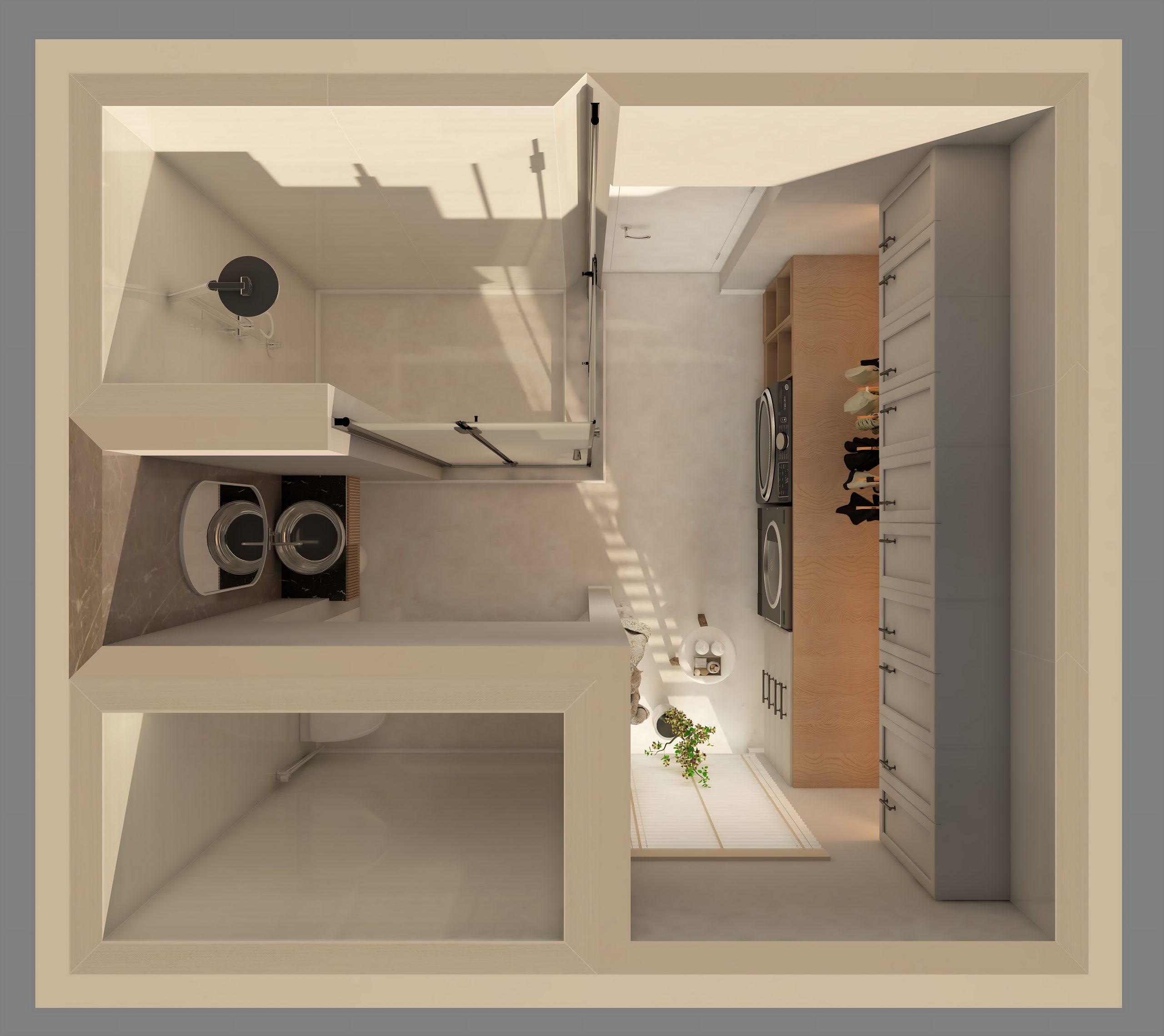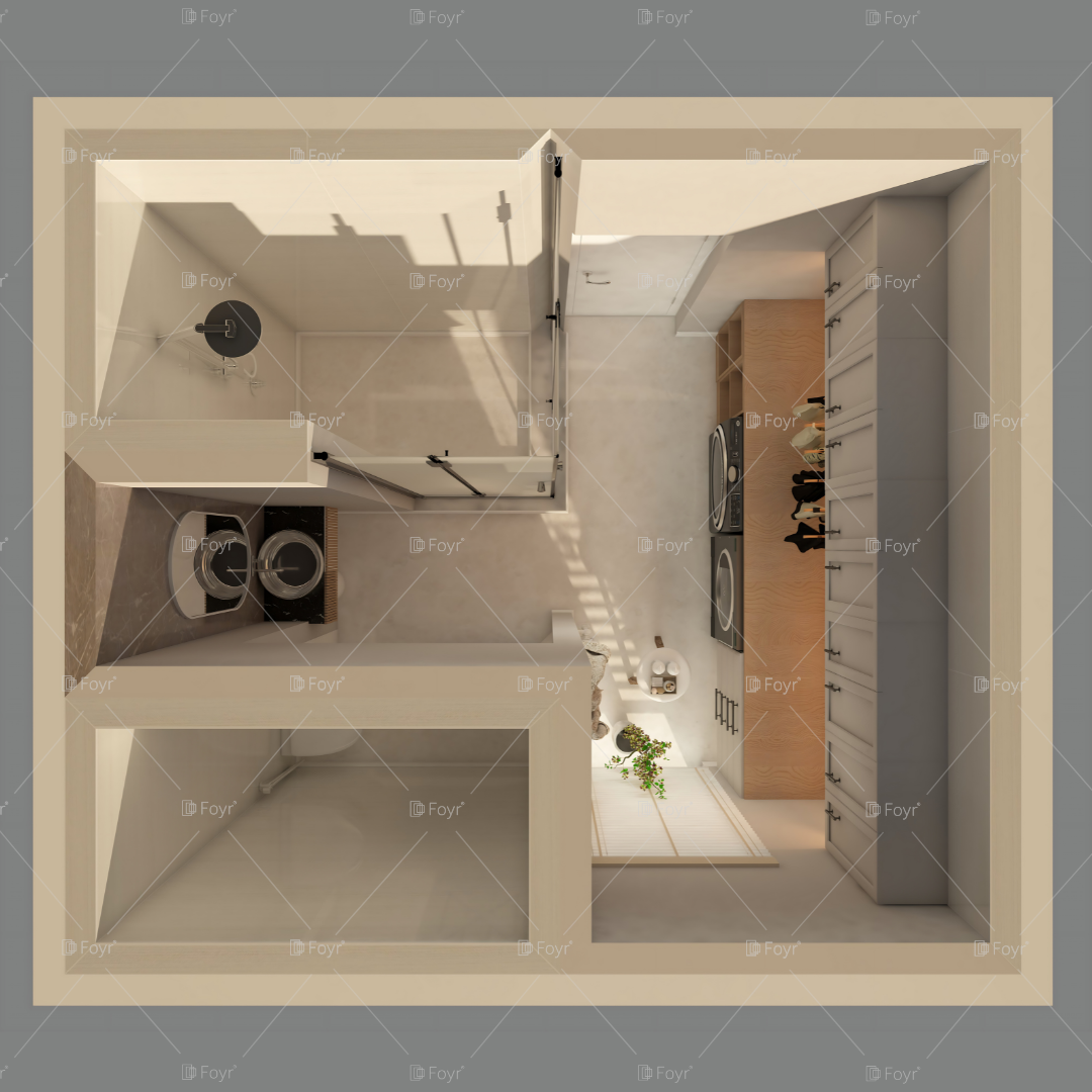 This modern-minimalist bathroom and laundry combo maximizes function within a clean, elegant layout. The design features a sleek glass-enclosed shower, paired with a compact vanity and stylish fixtures in a neutral palette of soft beige and light wood tones. The laundry area is neatly integrated along one wall, with a washer and dryer stacked beside tall storage cabinets for an organized and clutter-free appearance. Subtle decorative accents like plants and open shelving add warmth and personality, while the seamless material transitions and natural lighting enhance the open, contemporary feel of this multifunctional space.
