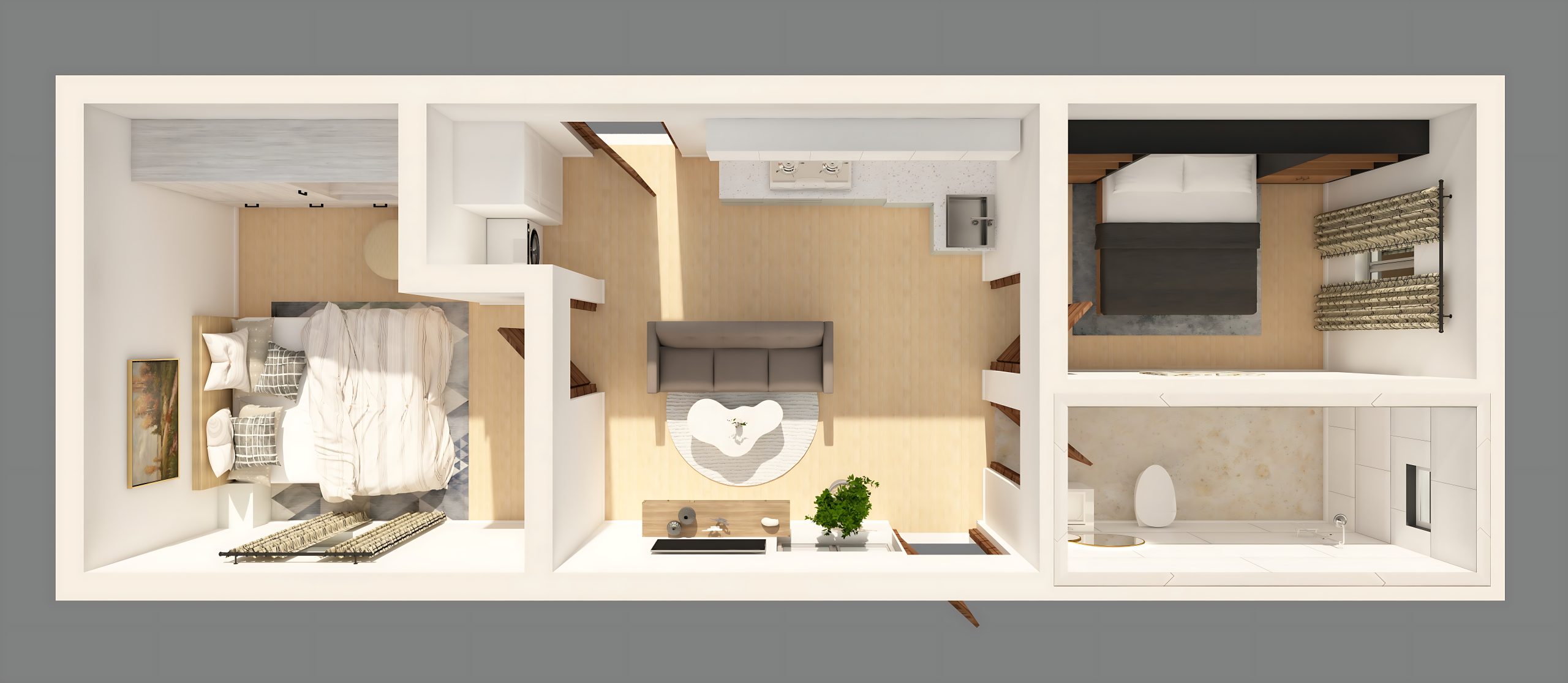 This modern-minimalist two-bedroom tiny home optimizes space with an elegant, efficient layout. The open living area features a compact sofa and a soft-toned rug, seamlessly connected to a linear kitchen with clean white cabinetry and minimalist fixtures. The primary bedroom offers a cozy retreat with natural lighting, while the secondary room can serve as a guest bedroom or office space. A full bathroom with bright white tiling and gold-accented fixtures adds a touch of sophistication. The use of warm wood flooring and neutral color tones enhances the feeling of spaciousness, creating a perfect balance between comfort and contemporary design.
