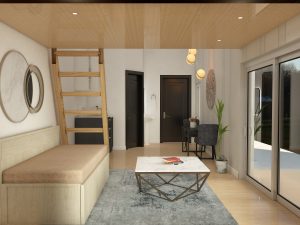 This charming modern-minimalist tiny house features a thoughtfully designed open space that combines a compact kitchen, cozy dining nook, and bright living area. Light wooden flooring and white walls create an airy, spacious ambiance enhanced by large glass doors that open to a lush outdoor view. The sleek kitchen offers functional cabinetry with minimalist finishes, while the built-in loft accessible via a wooden ladder adds extra sleeping or storage space. Contemporary pendant lighting and natural accents, such as indoor plants and textured wall art, complete the warm, refined aesthetic of this efficiently designed modern retreat.
