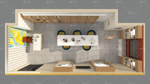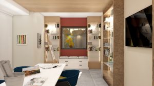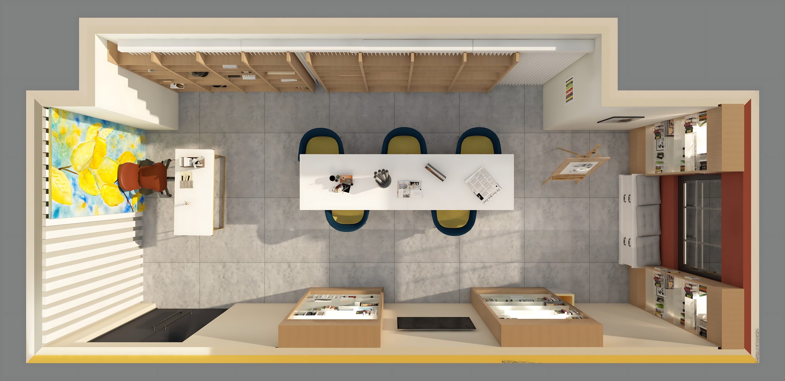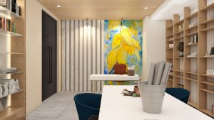 This modern-minimalist craft room is thoughtfully designed to combine creativity with organization. The central workspace features a sleek white table surrounded by colorful, comfortable chairs, perfect for collaborative projects or solo crafting. Wall-to-wall cabinetry provides ample storage for tools and materials, while glass display cases highlight completed works and art supplies. A dedicated desk area sits near a large window, offering abundant natural light and inspiration.