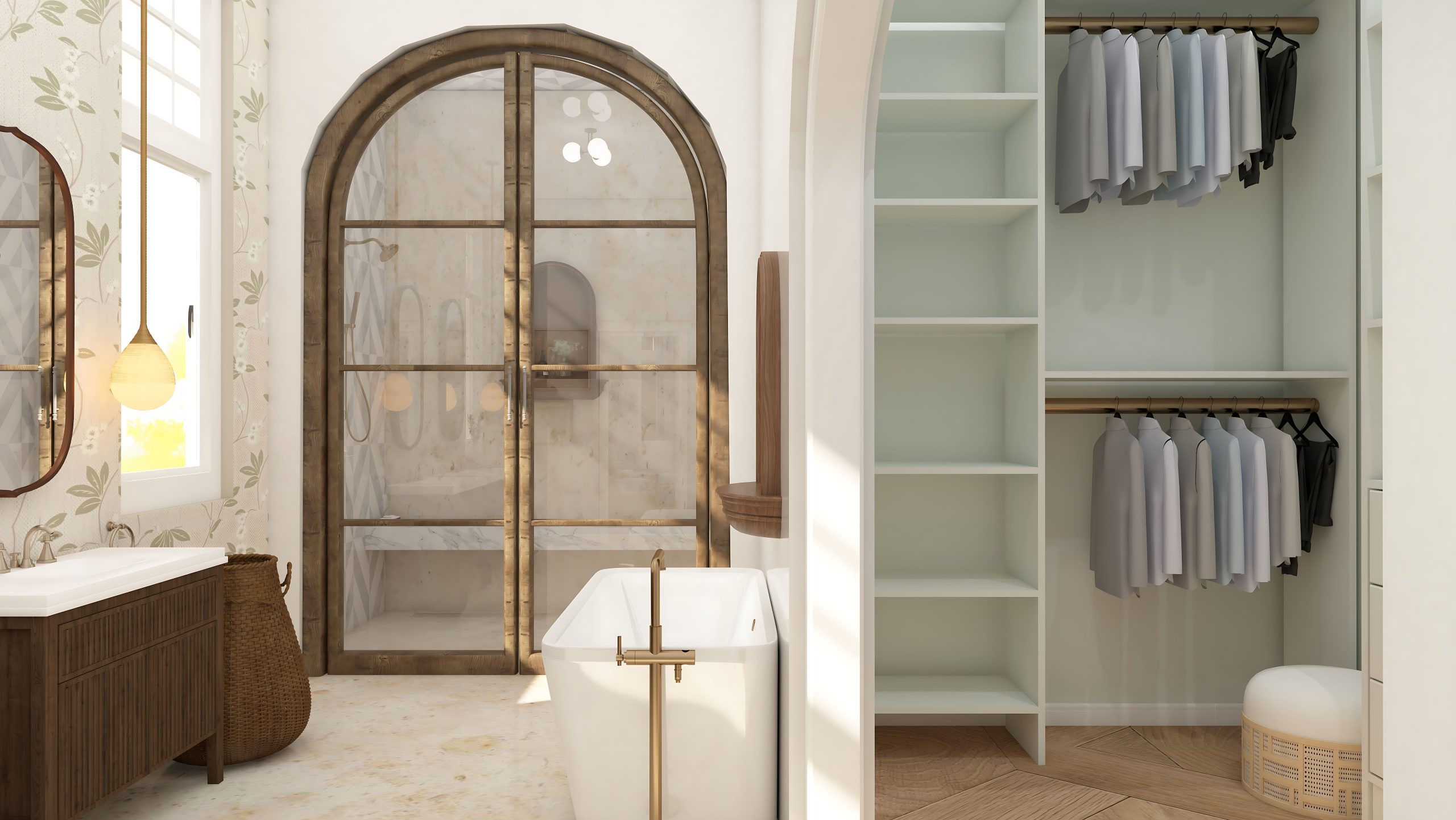 This elegant modern-minimalist master suite exudes warmth and sophistication with its refined materials and balanced layout. The bedroom features soft wood flooring, neutral tones, and expansive windows that flood the space with natural light. A cozy fireplace anchors the sitting area, while minimalist furniture and subtle greenery enhance tranquility. The adjoining bathroom offers a luxurious retreat with a double vanity, curved glass shower, and freestanding tub framed by patterned walls and rich textures. Thoughtful detailing, from curved architecture to integrated lighting, makes this suite a perfect blend of modern comfort and understated luxury.