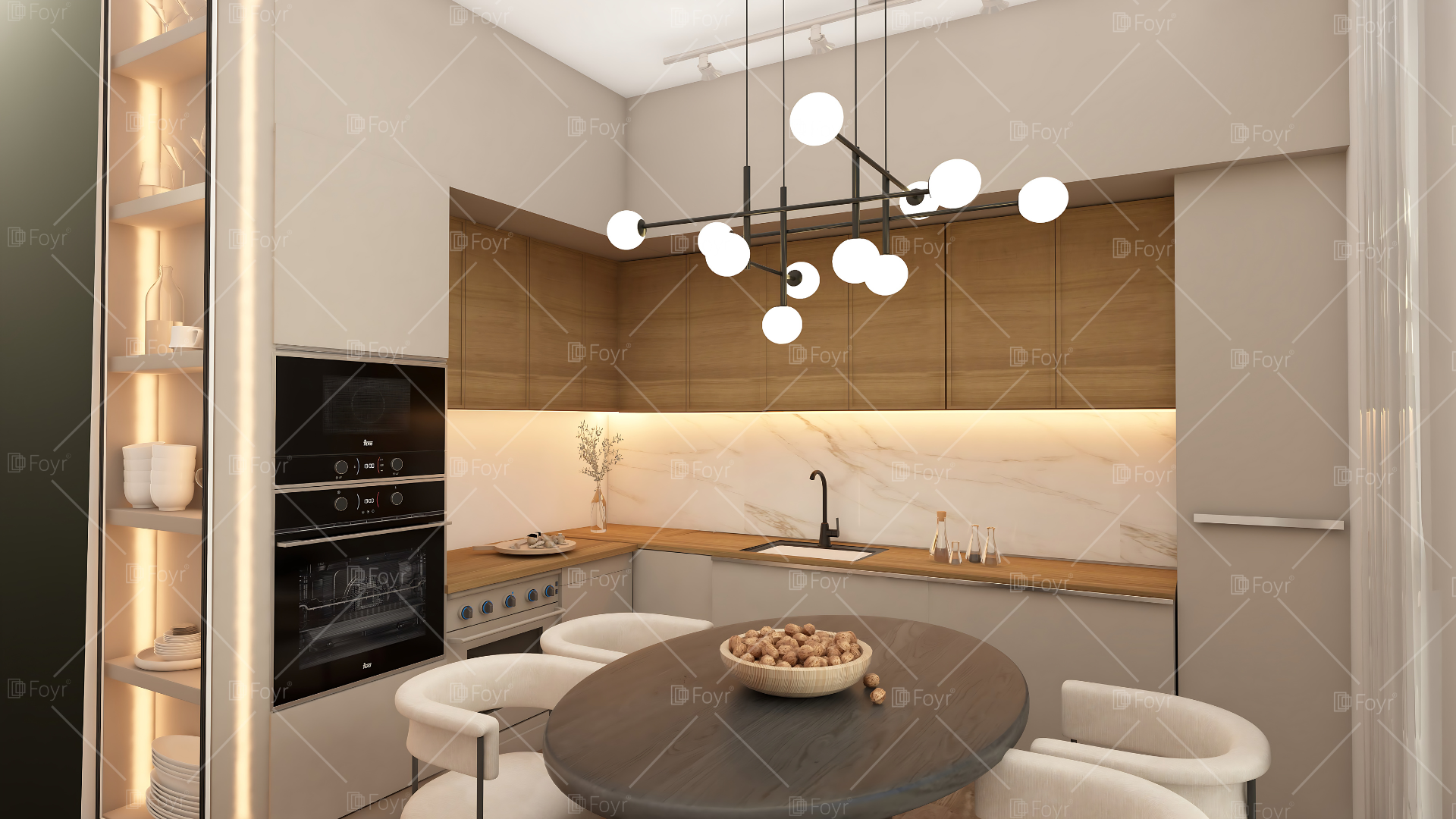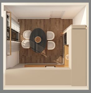 This compact modern kitchen combines warmth and simplicity with a sleek, space-efficient layout. A long countertop with integrated cabinetry and a matte black sink creates a clean, functional workspace. The warm wood textures of the flooring and countertop contrast beautifully with the minimalist white cabinetry. At the center, a small oval dining table with four sculptural chairs forms an inviting dining nook near a large window that floods the space with natural light. Perfect for apartments or small homes, this kitchen embodies Scandinavian elegance and practicality.