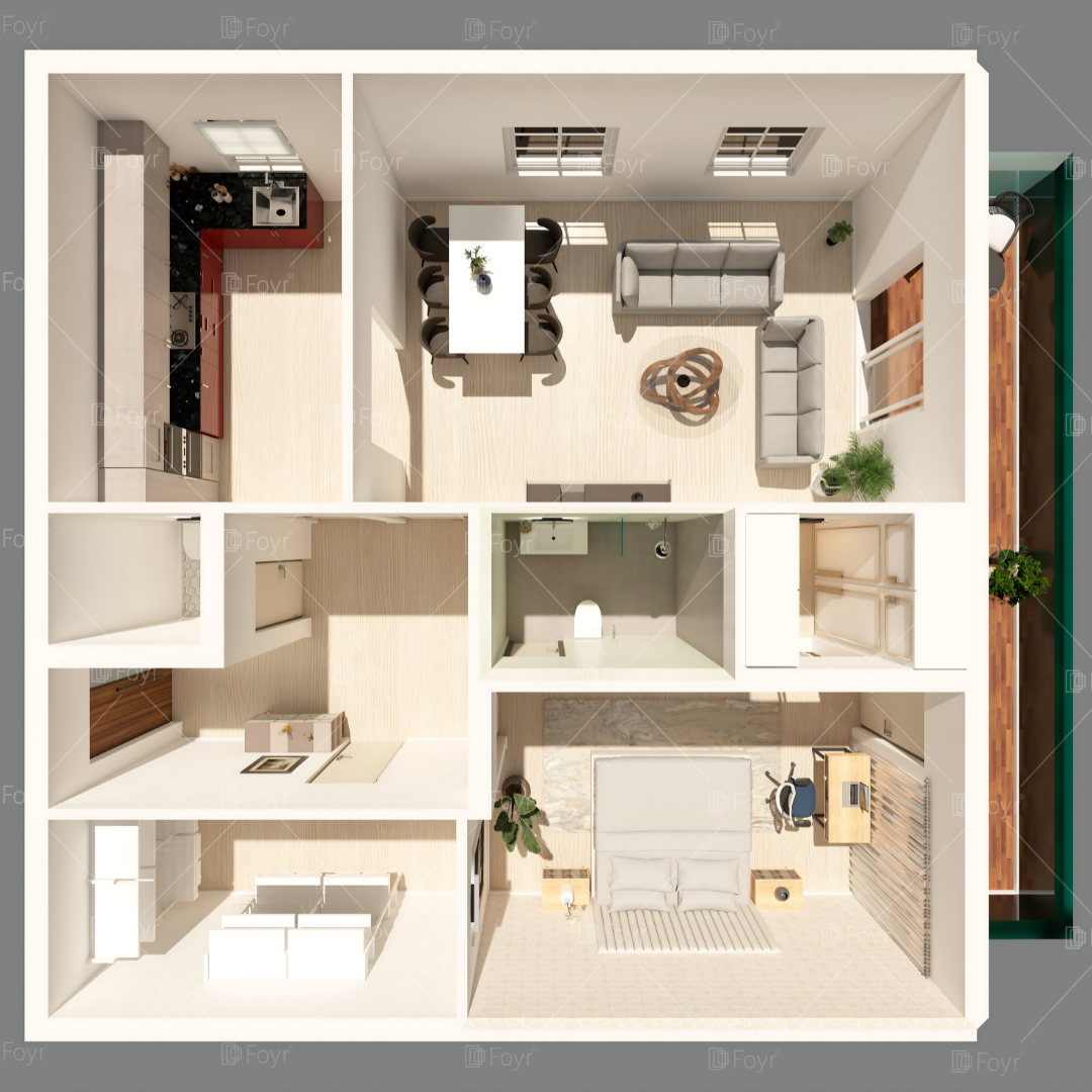 This compact modern-minimalist apartment features an open-concept layout with warm wooden flooring and clean white walls. The living area includes a cozy sectional sofa and a circular coffee table leading to a bright deck. A sleek kitchen with minimalist cabinetry and a small dining area complements the neutral palette. The bedroom is serene and functional, featuring a queen bed, ample storage, and direct access to a private deck with lounge chairs. A compact bathroom and efficient corridor layout enhance the smart use of space.