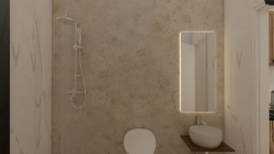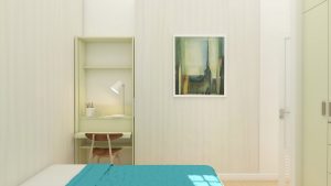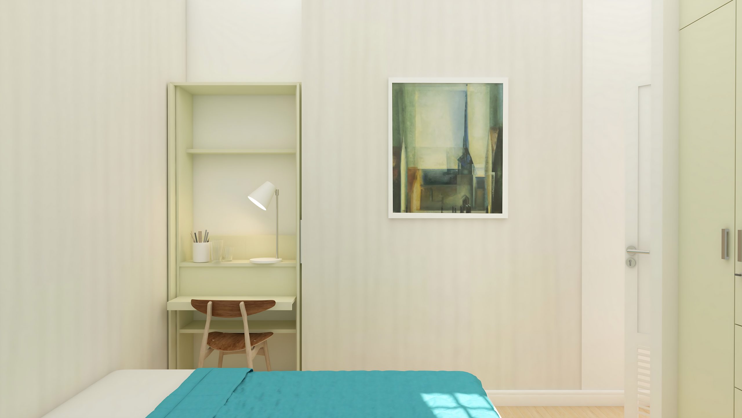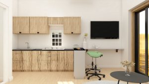 This modern-minimalist tiny home design offers a perfect blend of style and functionality within a compact footprint. The open-concept layout features a sleek galley kitchen with white cabinetry, black countertops, and a breakfast bar with mint-green stools. The adjacent living area includes a modern sofa and circular coffee table, positioned near large windows that flood the space with natural light. The cozy bedroom provides a peaceful retreat with minimalist décor and warm wooden flooring. Every element—from the streamlined kitchen to the subtle use of color—enhances the sense of openness, making this small home both efficient and inviting. (A compact 1BHK tiny home designed for efficient urban living. Featuring a separate bedroom, open living + dining, smart kitchenette, and well-planned bathroom — this 12x24 layout maximizes space without feeling cramped.)