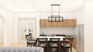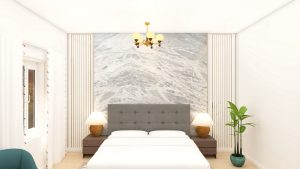 This expansive five-bedroom modern-minimalist home combines elegant design with smart functionality. The open living and dining area serves as the social hub, featuring soft neutral tones, cozy seating, and a sleek dining setup. The kitchen blends dark and light finishes for a refined aesthetic, optimized for convenience and flow. Each bedroom is designed for comfort and serenity, with large windows inviting ample natural light. The master suite includes a stylish private retreat with lounge chairs and direct access to a spacious bathroom. The home also boasts a three-car garage and a small inner courtyard with greenery, enhancing the home’s balance of practicality and relaxation.