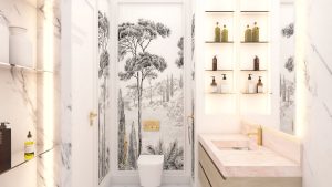 This elegant marble bathroom combines classic sophistication with modern touches. The soft blush-toned vanity contrasts beautifully with the white marble surfaces, while brushed gold fixtures and accents add a refined sense of luxury. Artistic wall detailing featuring monochrome botanical motifs enhances the visual depth and character of the space. Built-in shelving provides subtle storage, maintaining the clean, uncluttered aesthetic. The harmonious blend of textures, warm lighting, and natural tones creates a serene, spa-like retreat that feels both timeless and contemporary.