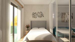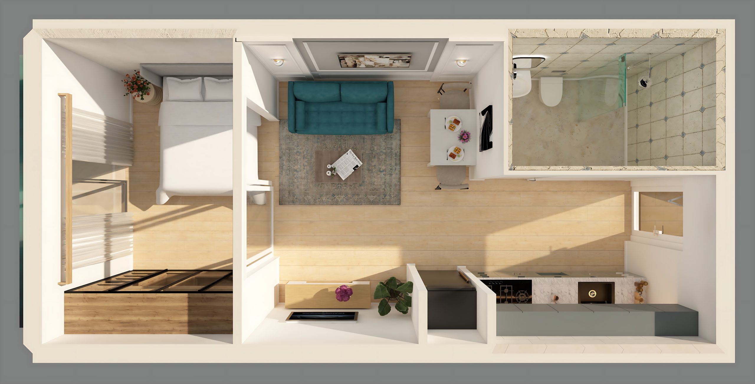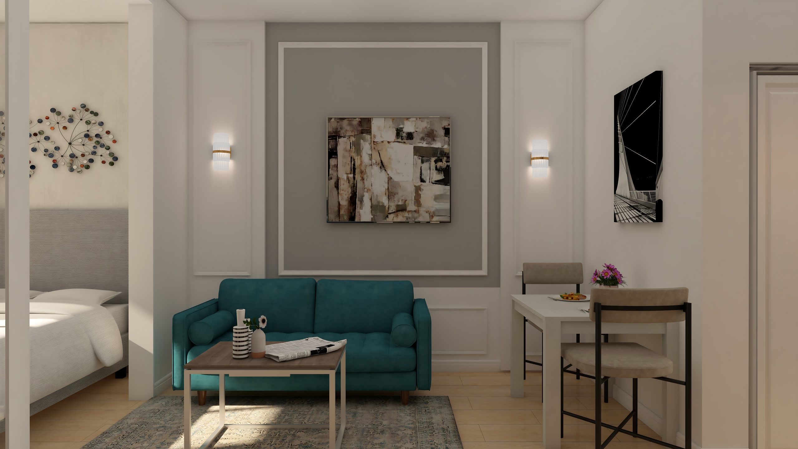 This cozy studio apartment maximizes every inch of its compact layout with an open and efficient design. The living area features a teal sofa and coffee table, seamlessly flowing into a small dining nook and an adjacent galley kitchen. A private bedroom is separated by a partial wall, creating a sense of privacy while maintaining an open feel. The clean bathroom design includes a glass shower for added spaciousness. Large windows flood the interior with natural light, highlighting the warm wood floors and neutral finishes that create a bright, airy atmosphere perfect for modern city living.