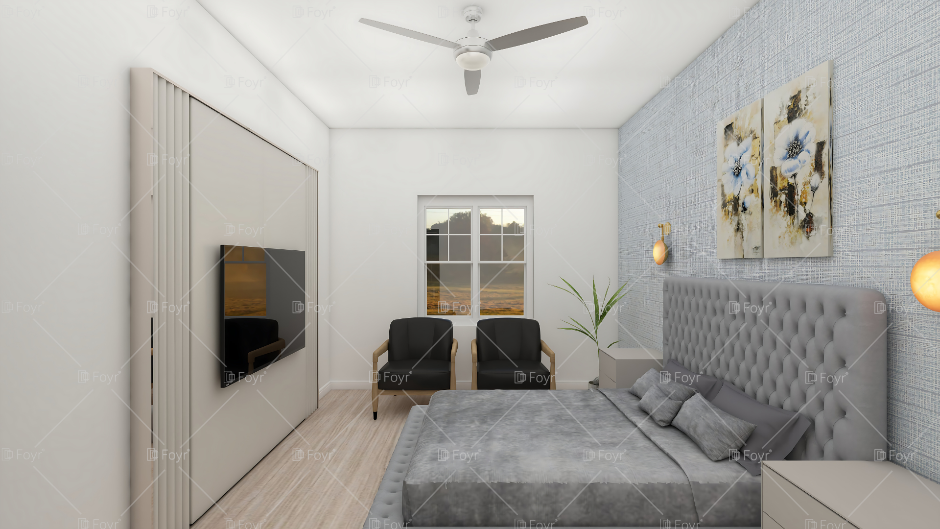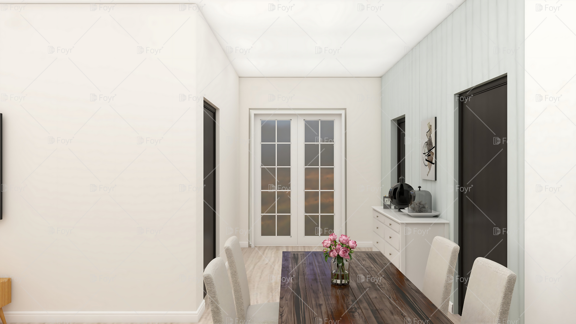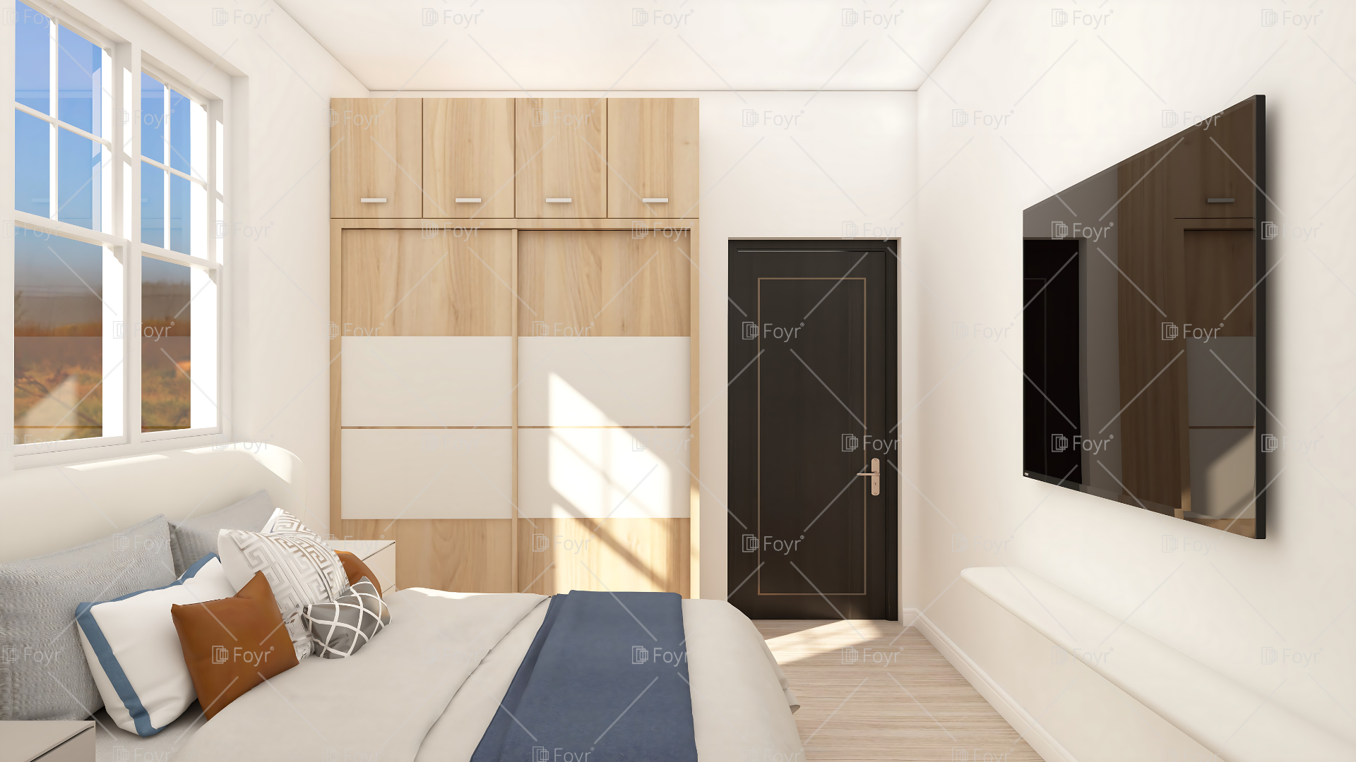 This modern-minimalist three-bedroom home design showcases a clean, open layout that blends simplicity with warmth. The central space features a contemporary dining area with a dark wood table and elegant white chairs, flowing naturally into the cozy living zone. The kitchen stands out with sleek cabinetry, marble backsplash, and a compact yet efficient arrangement. Each bedroom emphasizes minimal décor and natural tones, creating calm and comfortable retreats. The bathroom continues the minimalist aesthetic with neutral tiles and refined fixtures. The design maximizes natural light and open space, providing an ideal balance of comfort and functionality.