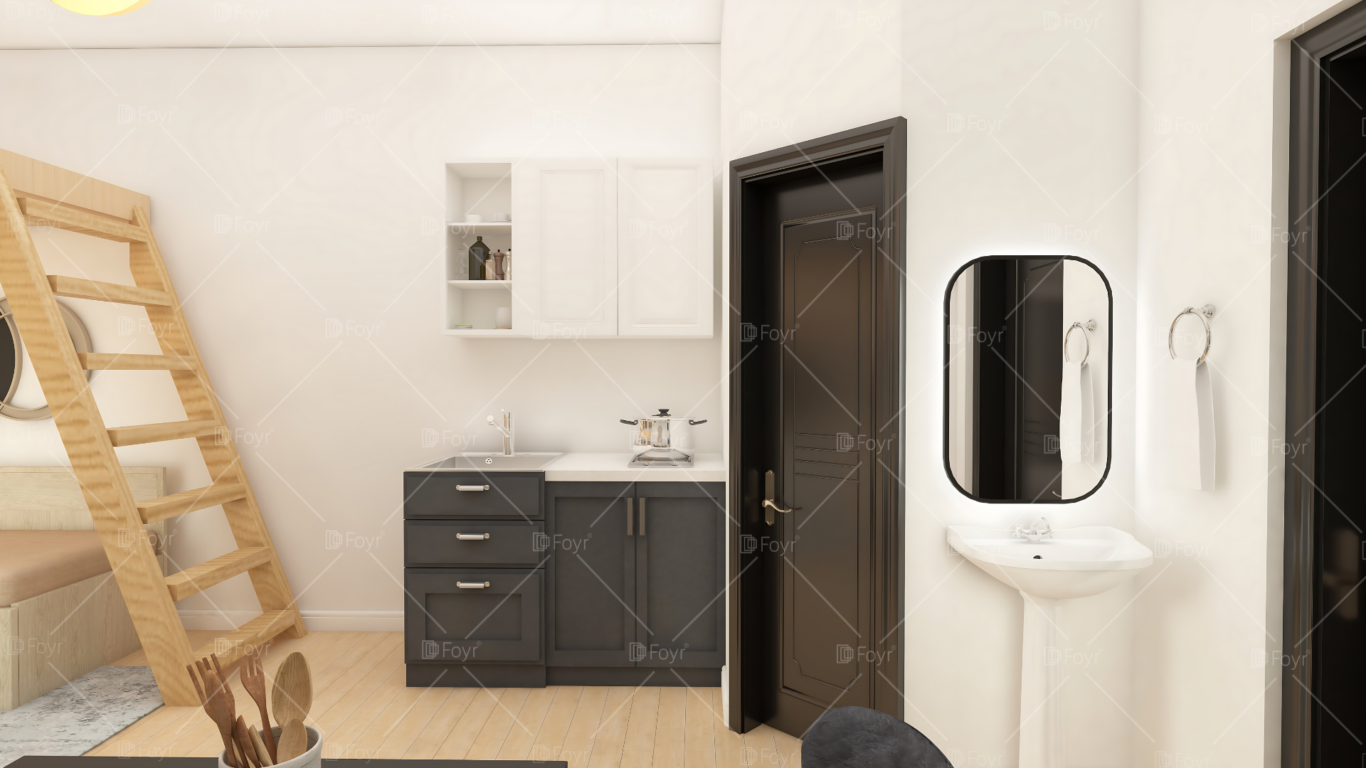 This charming modern-minimalist tiny house features a thoughtfully designed open space that combines a compact kitchen, cozy dining nook, and bright living area. Light wooden flooring and white walls create an airy, spacious ambiance enhanced by large glass doors that open to a lush outdoor view. The sleek kitchen offers functional cabinetry with minimalist finishes, while the built-in loft accessible via a wooden ladder adds extra sleeping or storage space. Contemporary pendant lighting and natural accents, such as indoor plants and textured wall art, complete the warm, refined aesthetic of this efficiently designed modern retreat.