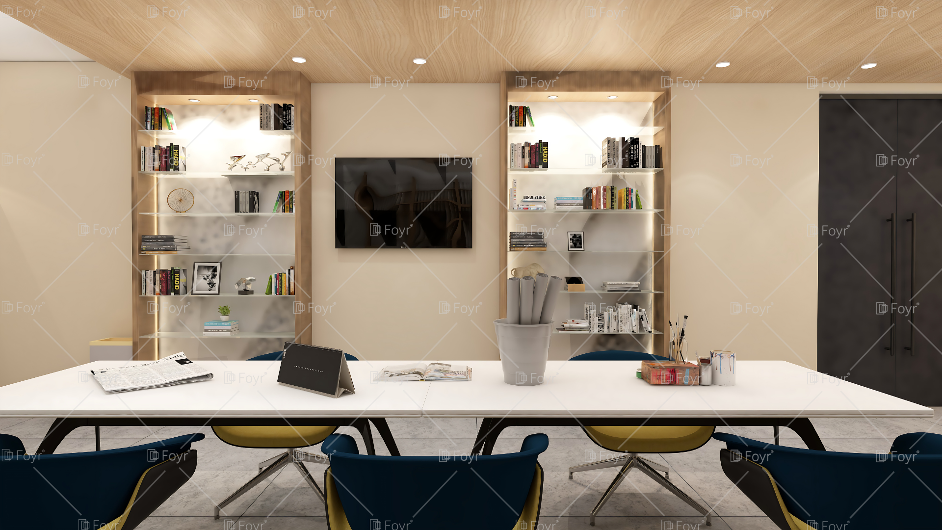 This modern-minimalist craft room is thoughtfully designed to combine creativity with organization. The central workspace features a sleek white table surrounded by colorful, comfortable chairs, perfect for collaborative projects or solo crafting. Wall-to-wall cabinetry provides ample storage for tools and materials, while glass display cases highlight completed works and art supplies. A dedicated desk area sits near a large window, offering abundant natural light and inspiration.