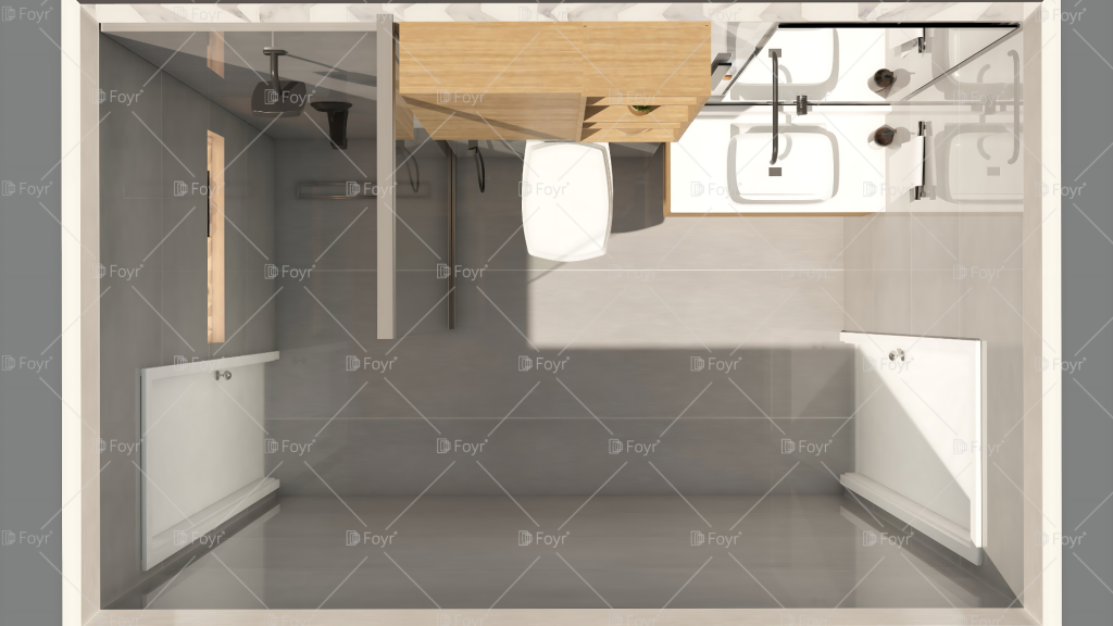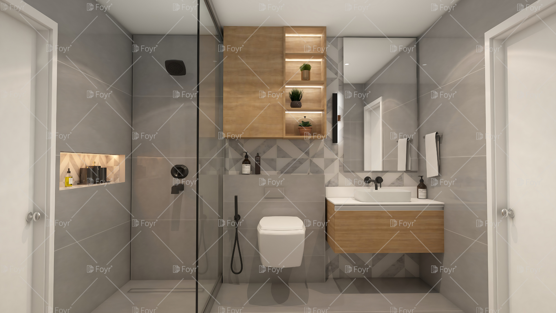 This modern-minimalist bathroom combines clean design with warm wooden accents for a serene, spa-like atmosphere. The layout features a walk-in glass shower with matte black fixtures, a wall-mounted toilet, and a floating vanity that enhances the sense of openness. Light gray tiles and geometric patterns on the feature wall add subtle texture and sophistication. Integrated shelving with soft lighting provides functional yet stylish storage for essentials and decorative elements. The overall aesthetic balances minimalism and comfort, making the space elegant, efficient, and inviting.