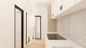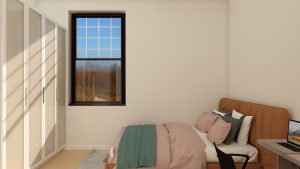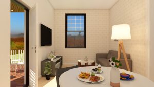 This beautifully designed two-bedroom modern-minimalist tiny home emphasizes clean lines and efficient spatial flow. The open living area features a cozy sofa, circular coffee table, and entertainment unit that open seamlessly to a welcoming front porch. The adjoining dining nook and compact kitchen use light wood tones and white finishes to create a bright, airy feel. Both bedrooms are cozy yet stylish—one serving as a serene primary suite, the other as a versatile guest or office space. The bathroom’s simple tiling and natural lighting maintain the minimalist aesthetic. Surrounded by greenery, this design blends modern comfort with the tranquility of nature.