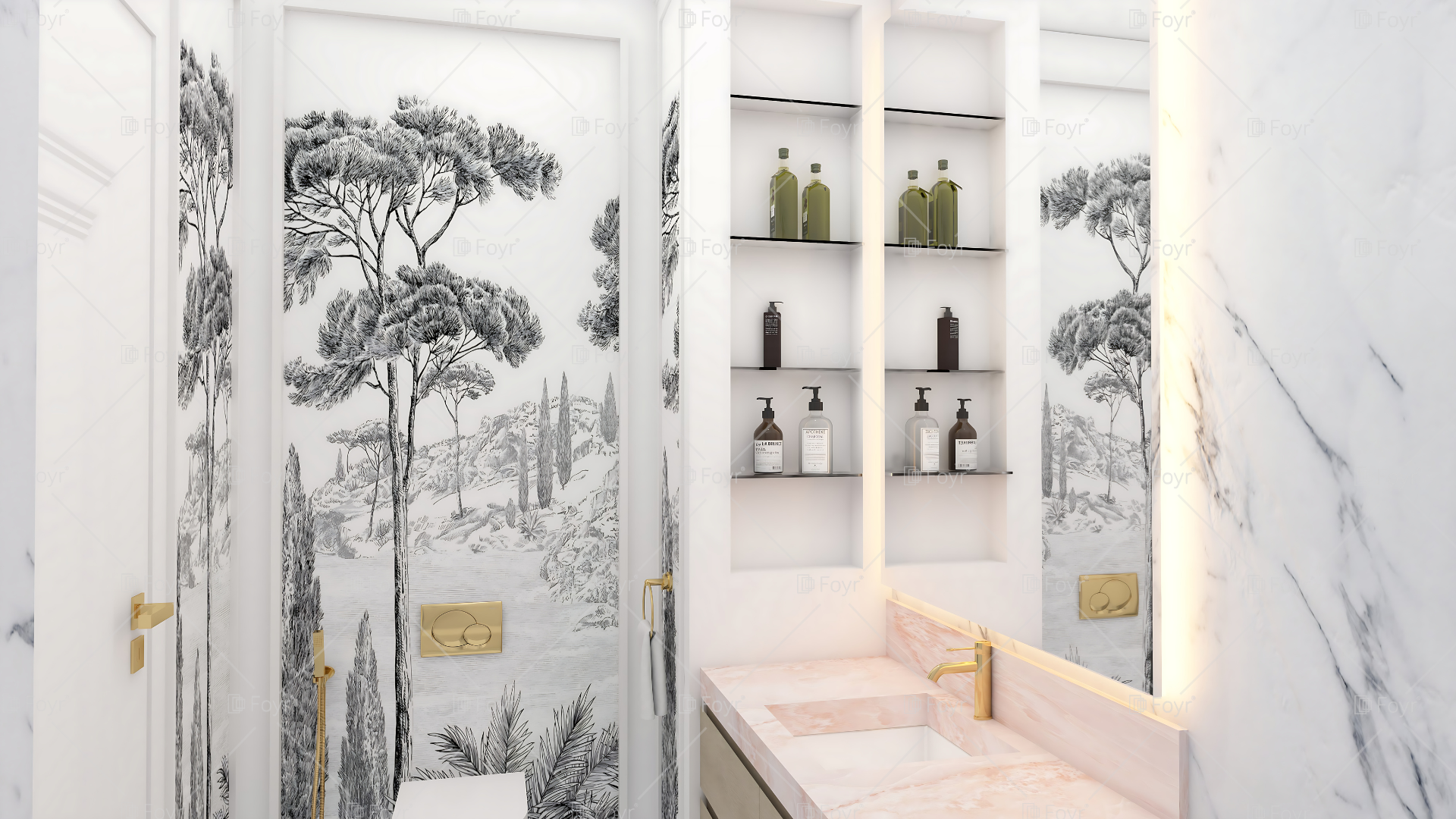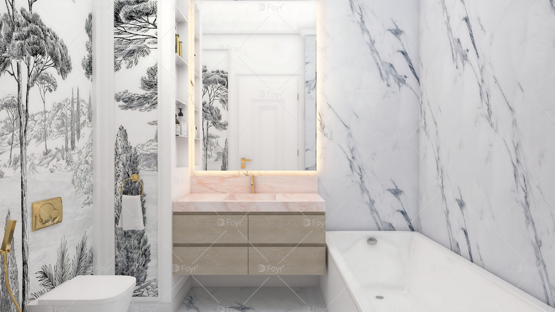 This elegant marble bathroom combines classic sophistication with modern touches. The soft blush-toned vanity contrasts beautifully with the white marble surfaces, while brushed gold fixtures and accents add a refined sense of luxury. Artistic wall detailing featuring monochrome botanical motifs enhances the visual depth and character of the space. Built-in shelving provides subtle storage, maintaining the clean, uncluttered aesthetic. The harmonious blend of textures, warm lighting, and natural tones creates a serene, spa-like retreat that feels both timeless and contemporary.