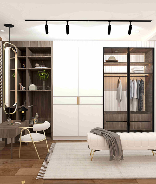 Modern Glam Walk-In Wardrobe with Vanity and Minimalist Design