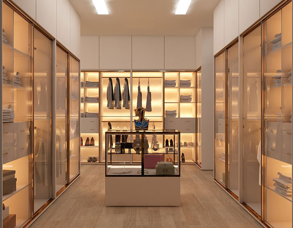 Dark Wood Walk-In Closet with Glass Doors and Ambient Lighting