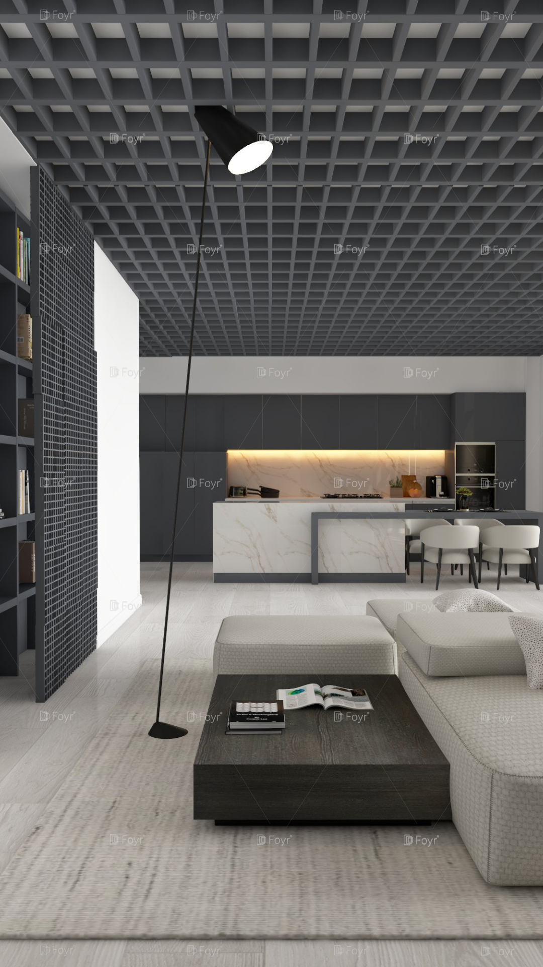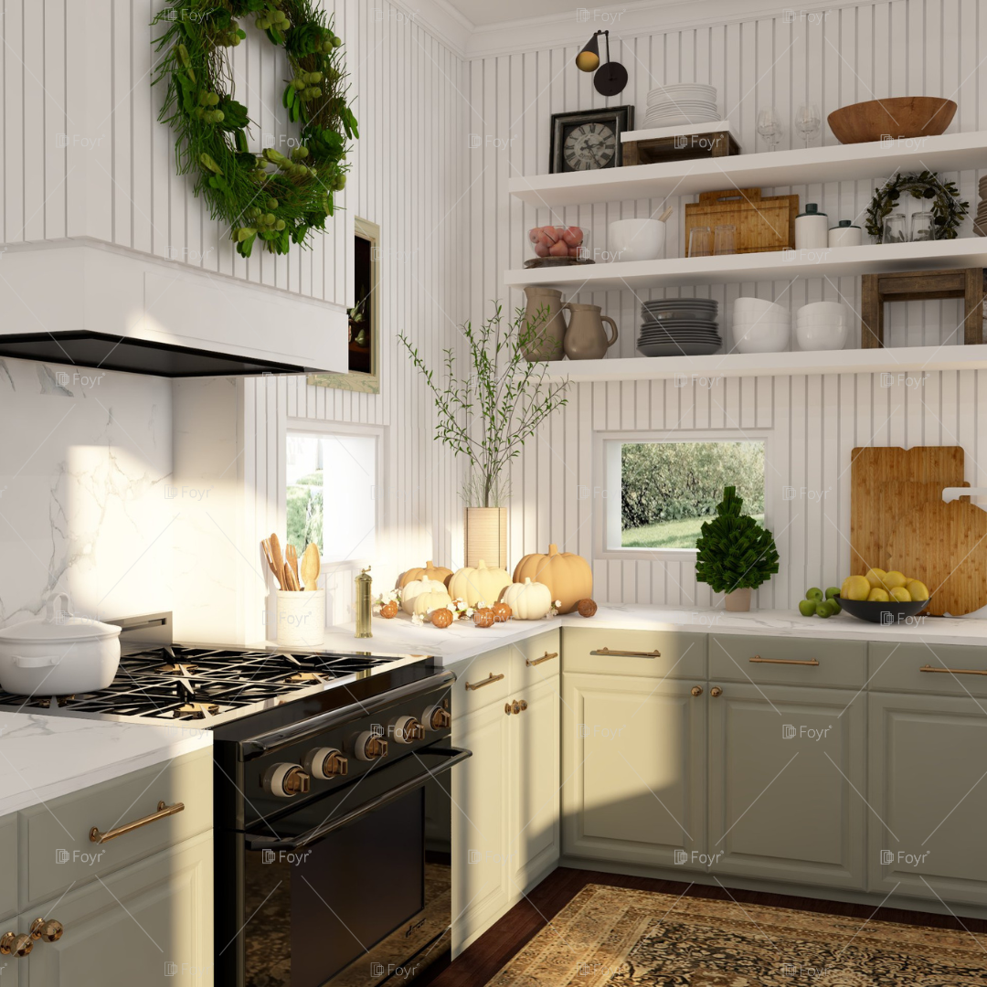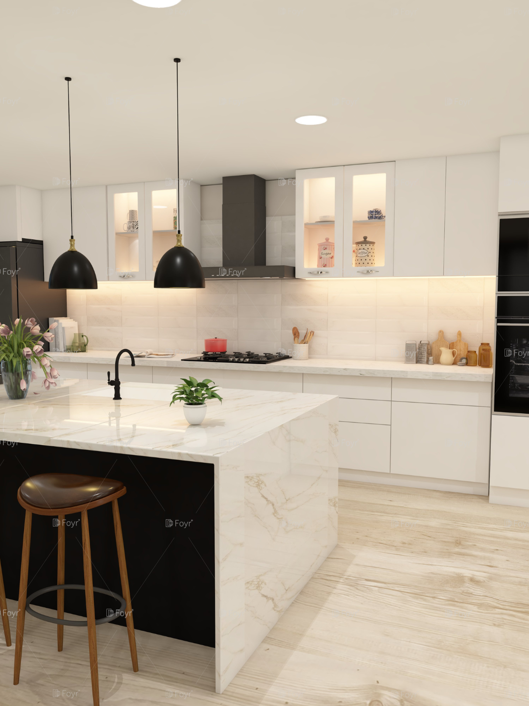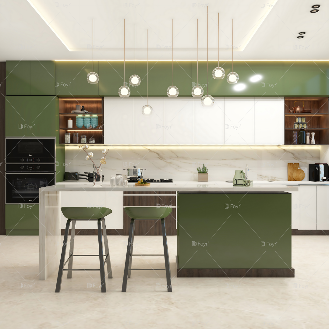 This is a modern kitchen with a fresh and clean look. It has green and white cabinets, a smooth marble backsplash, and a matching countertop. Two green stools are placed at a small island, which is great for quick meals. Hanging lights from the ceiling add a stylish and cozy touch. The space looks bright, well-organized, and perfect for cooking and dining.