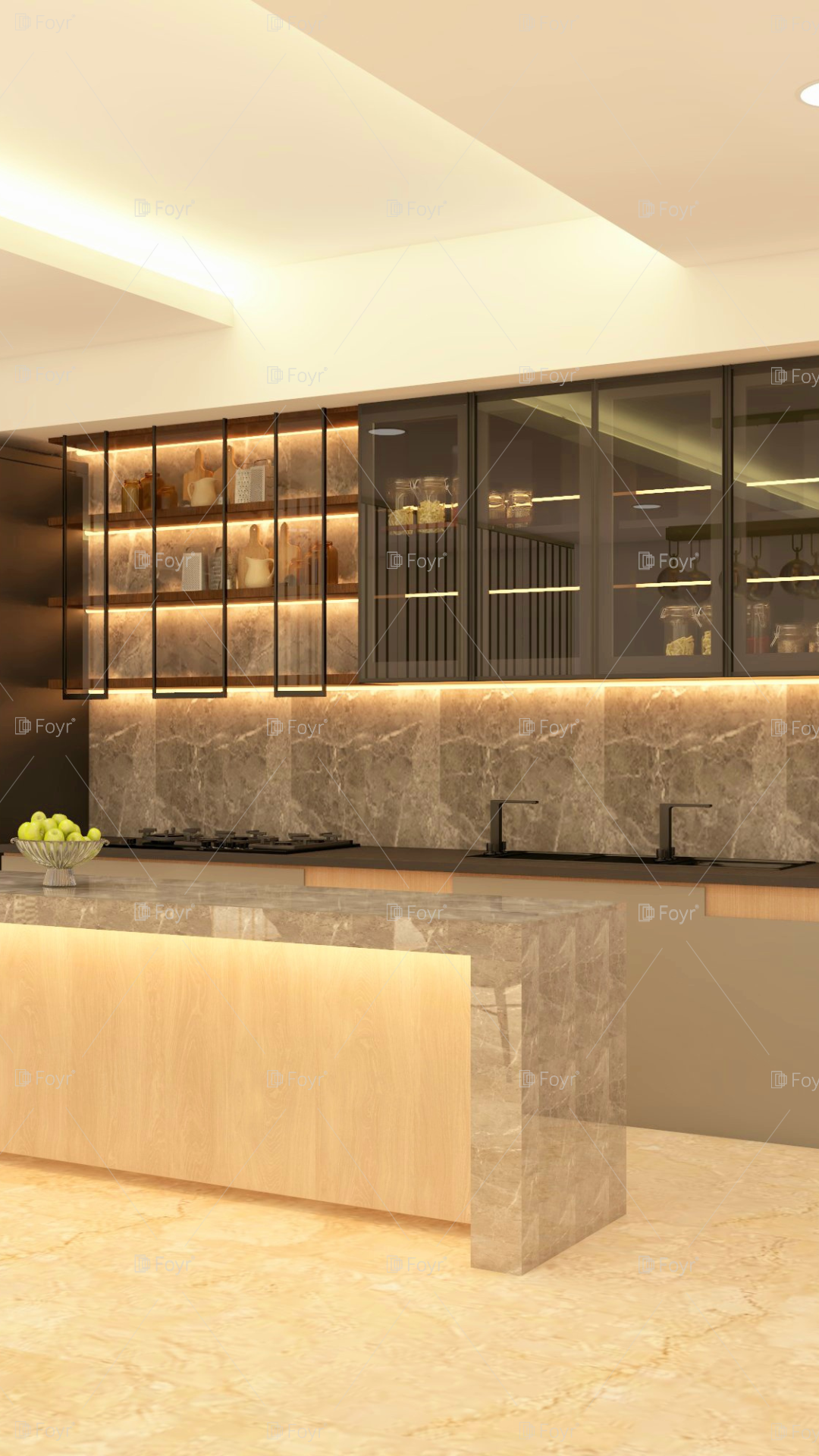 Sleek, functional, and visually warm — this kitchen features clean white cabinetry and a show-stopping marble waterfall island. Black accents through pendant lights and hardware add sophistication, while open shelves and wood floors keep the space grounded and welcoming.